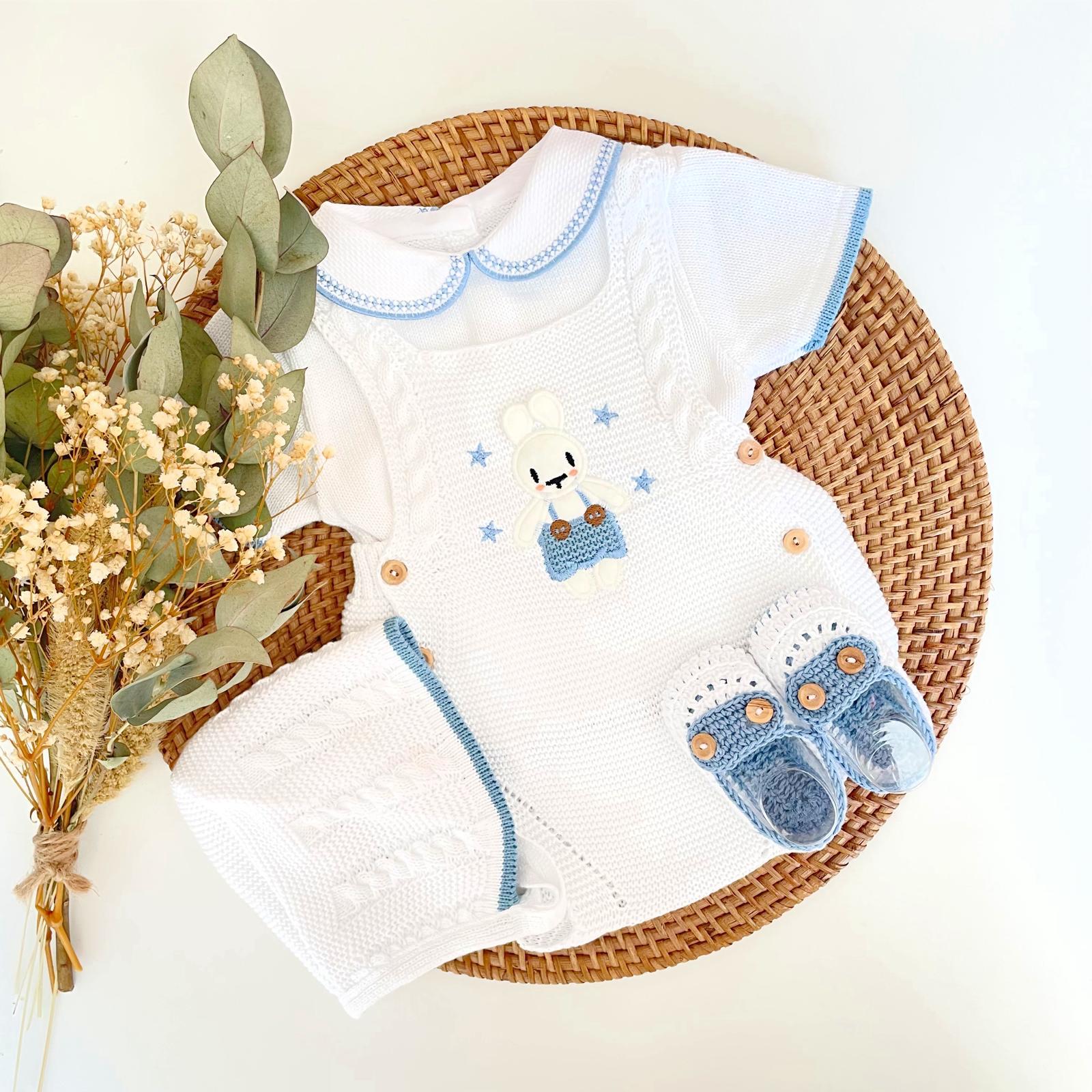 First-wear outfit to dress the baby in its first weeks of life. The set is three pieces of jersey, gaiter, hood and shoes. Made of 100% hypoallergenic cotton.